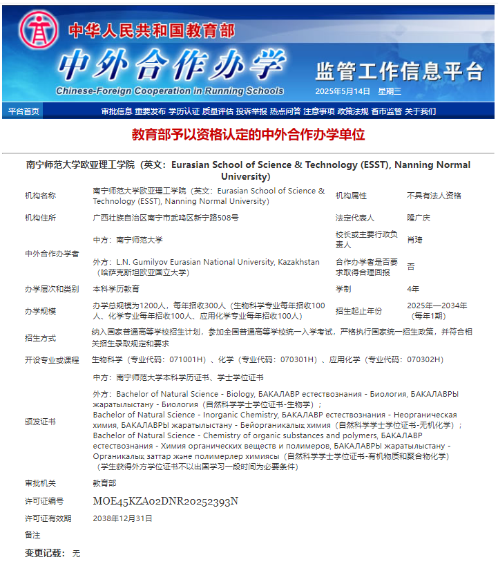 申报以来,在学校党委行政的领导下,国际交流合作处统筹协调教务处、化学与材料学院、环境与生命科学学院等单位,以高度的责任感和使命感,凝心聚力、集中攻关,实现我校中外合作办学机构从“0”到“1”的历史性突破。该机构的获批,标志着我校国际化办学迈上新台阶,我校形成了“以中外合作办学机构为引领、中外合作办学项目为支撑”的多元化、立体式中外联合培养体系,国际化人才培养展开了新篇章。未来,学校将以欧亚理工学院为平台,进一步深化与哈萨克斯坦的教育交流与科研合作,为广西打造面向东盟的教育开放合作高地,构建“一带一路”教育共同体作出积极贡献。