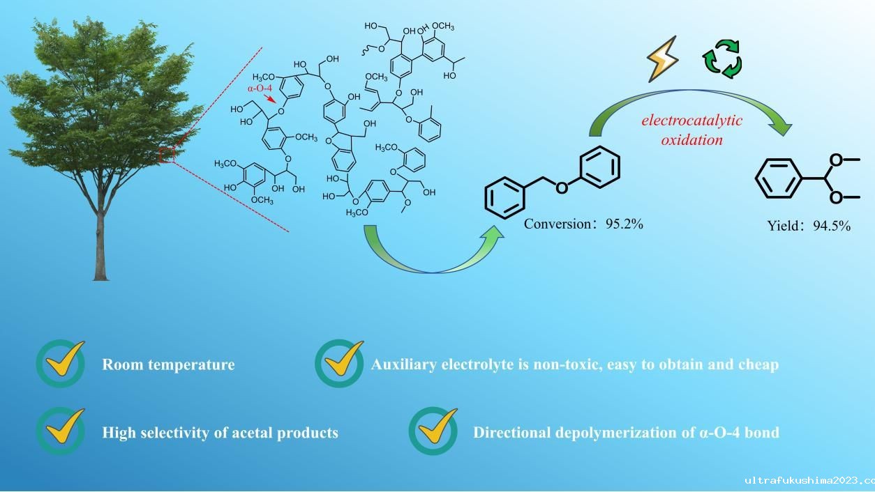 团队以高效催化断裂木质素中最稳定的C-O键和C-C键为目标,旨在解决木质素催化解聚效率低、选择性差的科学难题。首先,创新性使用非金属催化剂四丁基四氟硼酸铵(TBABF4)解聚木质素及其模型化合物。通过调控电场,使TBABF4同步协同发挥了催化剂和电解质的双重作用,在空气、室温和低电流条件下,对α-O-4型木质素模型分子的转化率高达95.7 %,主要产物苯甲醛二甲缩醛的收率高达92.4 %。该工作以“The Efficient and Directional Electrocatalytic Depolymerization of α-O-4 Bond in Lignin by Auxiliary Electrolyte”为题发表于化学领域国际权威期刊《Industrial Crops and Products》(中科院一区,IF=5.6)。