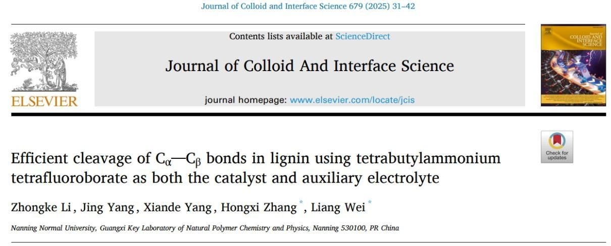 随后,团队进一步探究了TBABF4催化解聚木质素中Cα-Cβ的性能。通过实验设计与优化,在室温、空气和低电流条件下成功解聚了木质素中最稳定的Cα-Cβ键。该工作以“ Efficient Cleavage of Cα-Cβ Bonds in Lignin Using Tetrabutylammonium Tetrafluoroborate as Catalysts”为题发表于化学领域国际权威期刊《Journal of Colloid And Interface Science》(中科院一区,IF=9.4)。