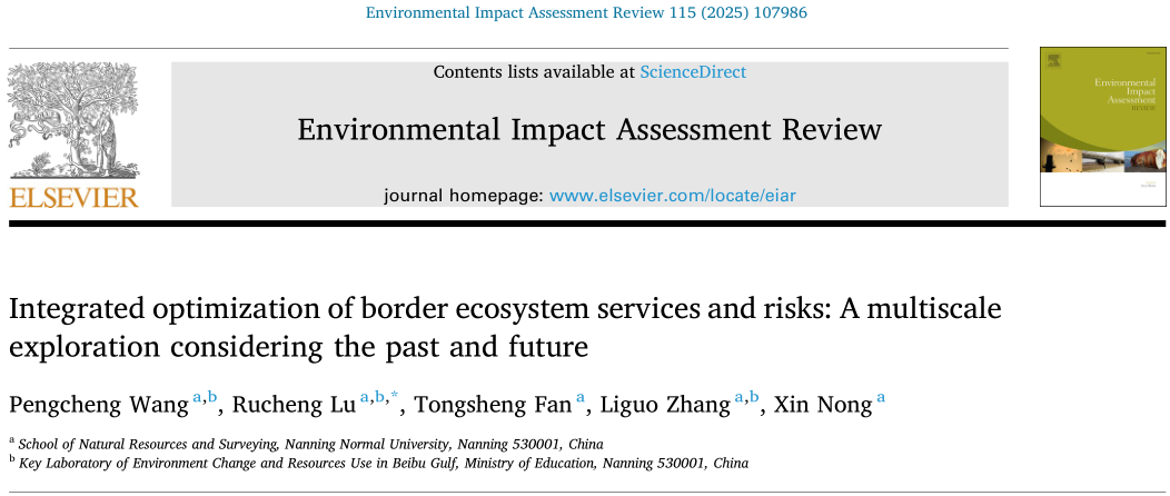 研究团队在Environmental Impact Assessment Review(中科院一区TOP,SSCI-Q1、EI)发表了题为“Integrated optimization of border ecosystem services and risks: A multiscale exploration considering the past and future”的研究论文。文章聚焦于边境地区独特地缘政治单元,耦合系列区域差异与时空映射模型,从多尺度识别并模拟生态系统服务-风险,进而建立生态安全区域的集成优化方案,提出系列政策建议,为全球边境生态安全的协同治理提供一定参考。该文由陆汝成教授为通讯作者,硕士研究生王鹏程为第一作者共同完成。